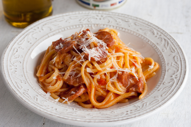 So hatte ich es noch nie probiert. Ich nehme statt der normalen Salami, getrocknete (scharfe) Salsiccia und koche die Nudeln in einem extra Topf. Muss ich aber unbedingt mal probieren.